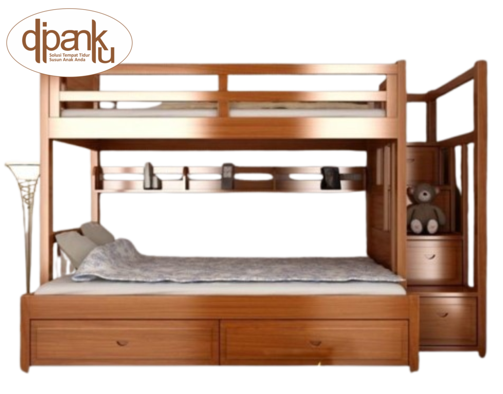 Dipan Tingkat Kayu Jati Super – Desain yang di terapkan untuk produk ranjang tingkat dengan 2 kasur atas dan bawah, serta sebuah laci panjang besar pada bagian ranjang bawah untuk menyimpan sebuah seprai atau selimut. Untuk ranjang bagian atas dilengkapi dengan tangga berlaci pada setiap undakan nya sangat berguna untuk menyimpan mainan atau barang-barang milik si buah hati.